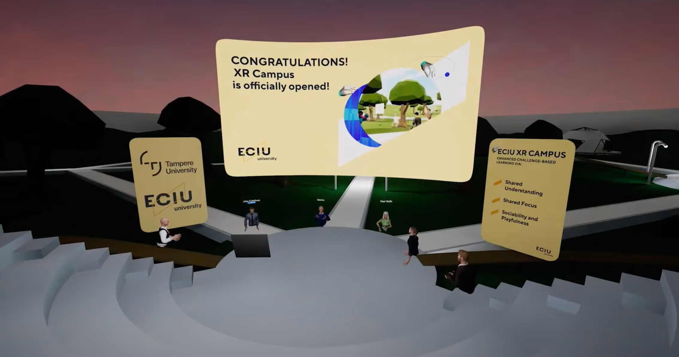 The Extended Reality (XR) Campus was developed by Zoan, a creator of virtual worlds, in close collaboration with Tampere University, one of the ECIU partner institutions. After the Commissioner opened the Campus, Miikka Rosendahl (CEO of ZOAN) presented the future of XR technology. Professor Henri Pirkkalainen (Tampere University) presented how the XR Campus is used himself and learners to solve a real-life challenge of Tampere City. The event closed in a Challenge Room, where learners were working together to solve a challenge of Tampere City: “It is like we are working face to face”, said one of the learners about her experience of using the XR Campus as a tool in her learning. After the opening, the ECIU Community from all over Europe joined the XR Campus and met in virtual reality. No distance keeping was required.