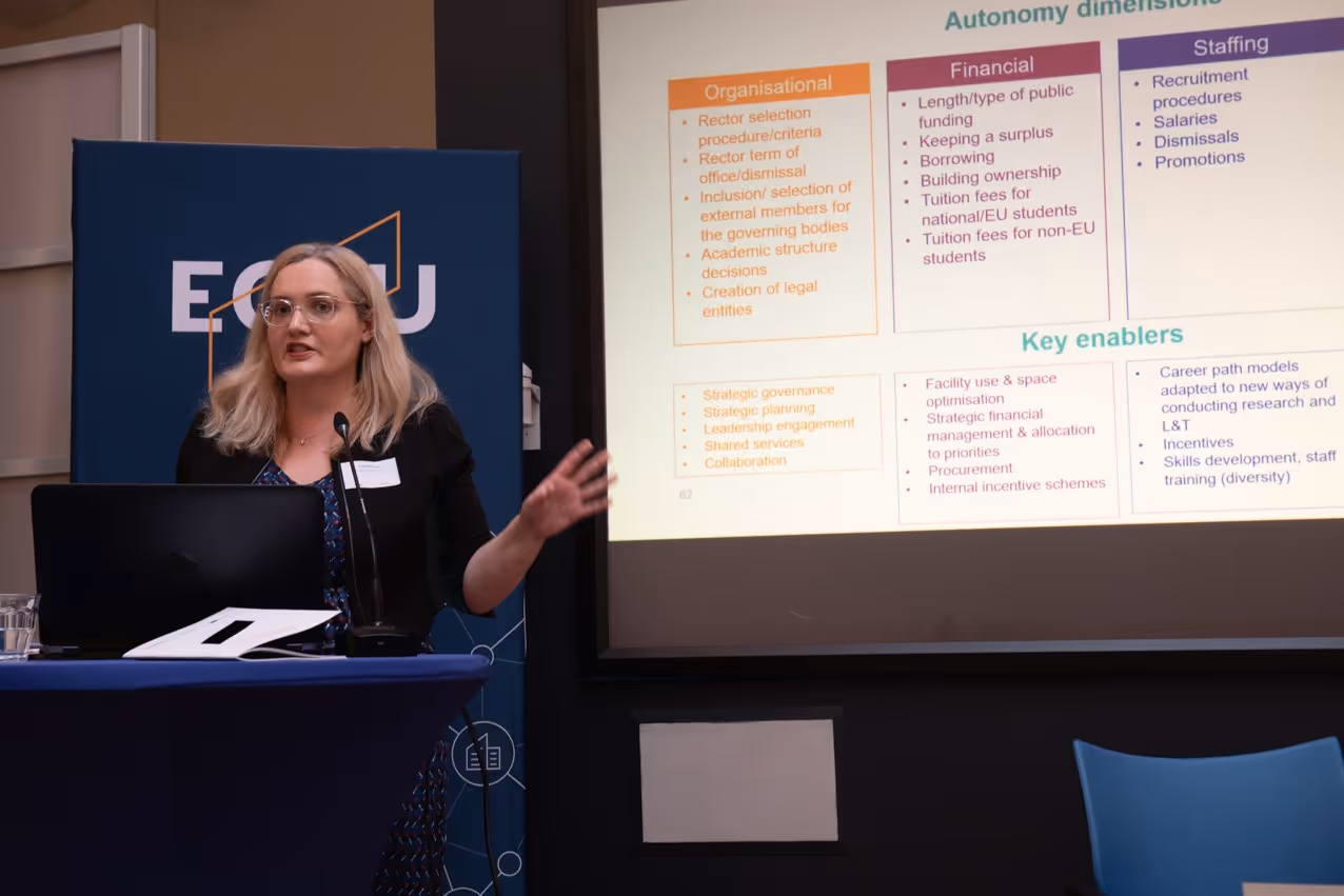 Enora Bennetot Pruvot, Deputy for Governance, Funding and Public Policy Development at the European University Association (EUA) closed the event, giving an overview on the Autonomy Scorecard 2023. The analysis by the EUA showed the many different frameworks in governance, funding and administration in Europe. The autonomy of public universities has multiple dimensions, including the ability to create legal entities, or decide on internal funding allocation. Pruvot compared the freedom of several EU countries on the ESEU use cases, showcasing the complex and multi-layered reality, as each sub-dimension varies across universities and across countries.